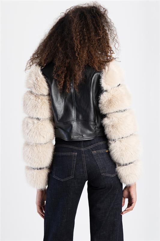 This cropped PU leather jacket features elegant fur sleeves, combining edgy biker style with refined sophistication. Its tailored silhouette enhances your look, making it perfect for festival wear or chic everyday outfits. Enjoy a luxurious blend of texture and modern design.