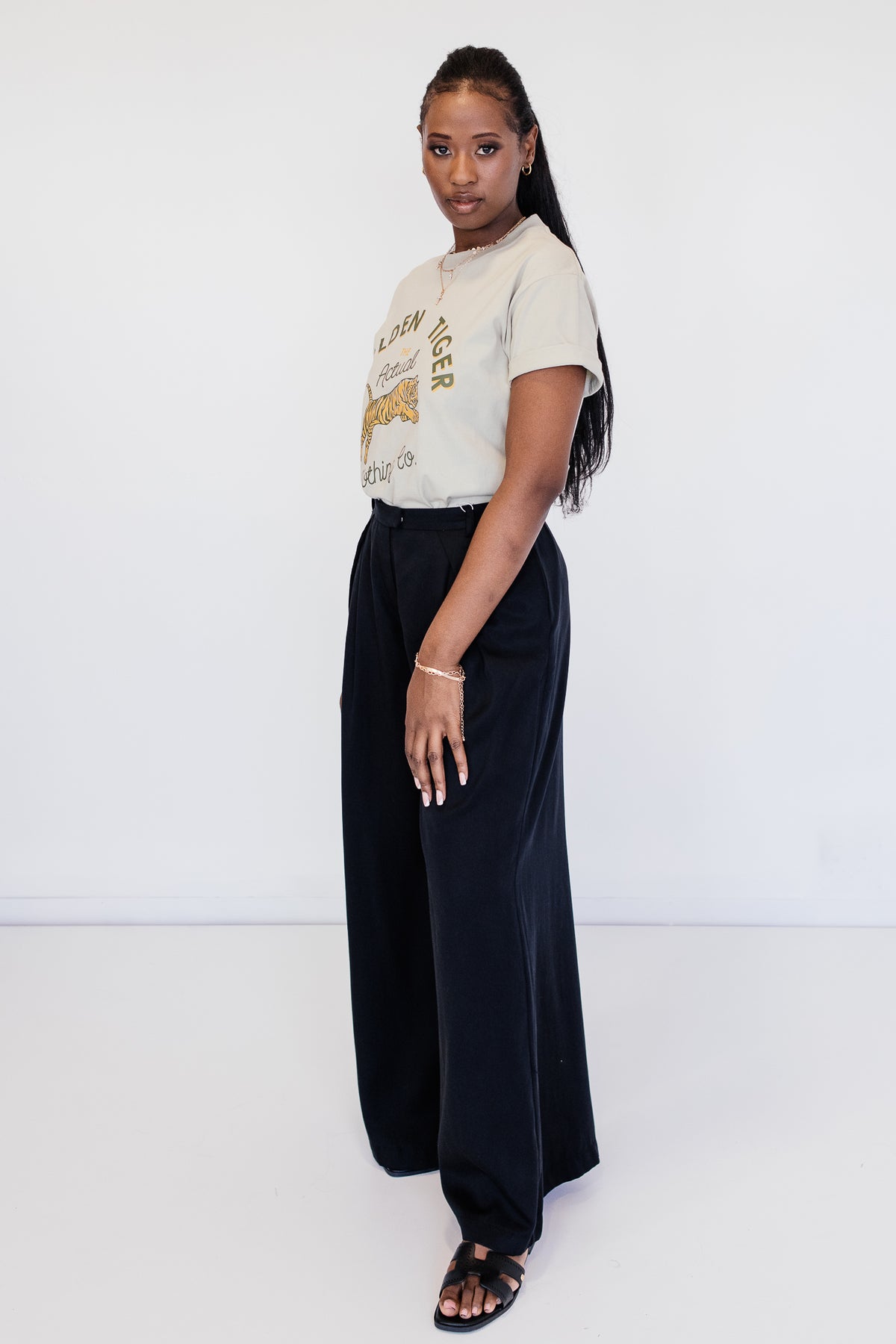 Elevate your wardrobe with these Jarina Pants, the perfect blend of sophistication and relaxed style. Featuring a flattering high waist and elegant front pleats, these pants offer a flowy silhouette that moves with ease and grace.