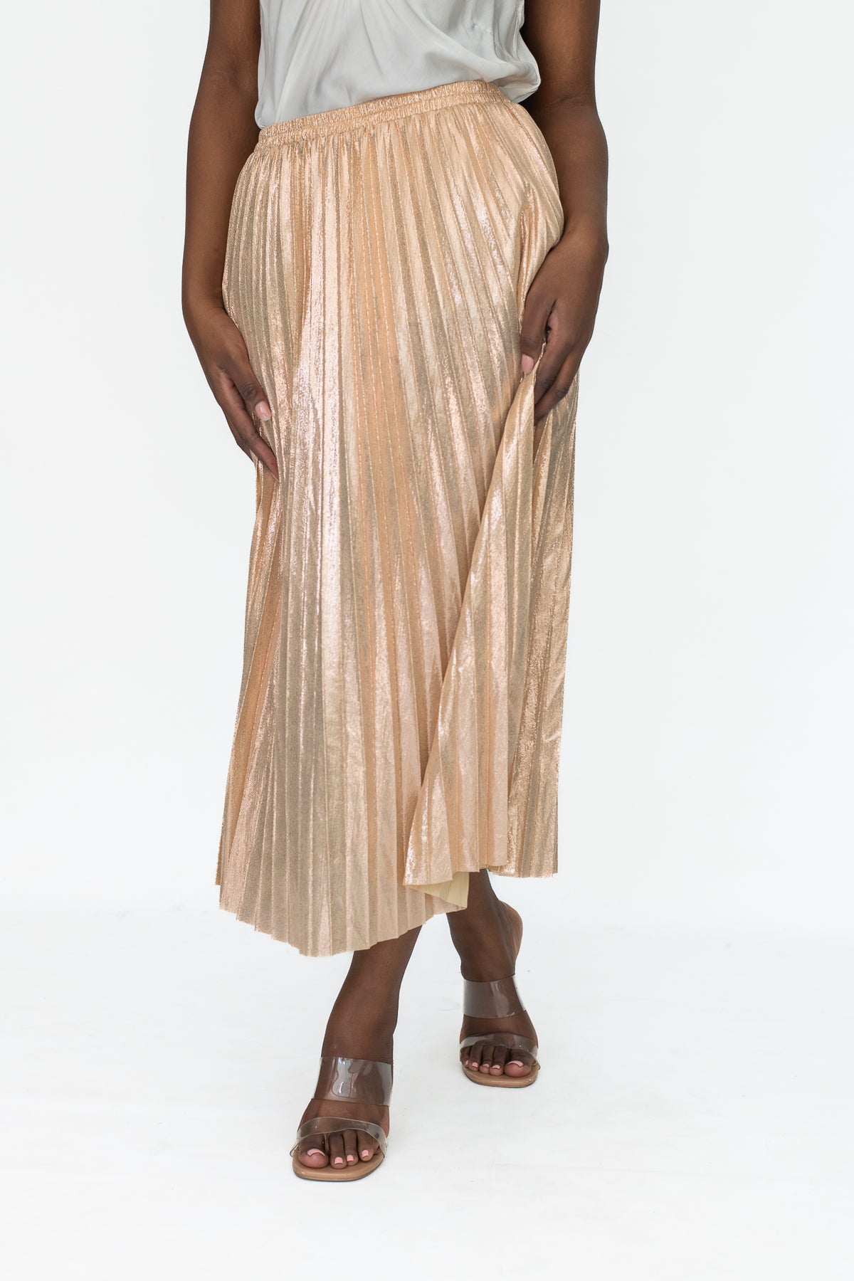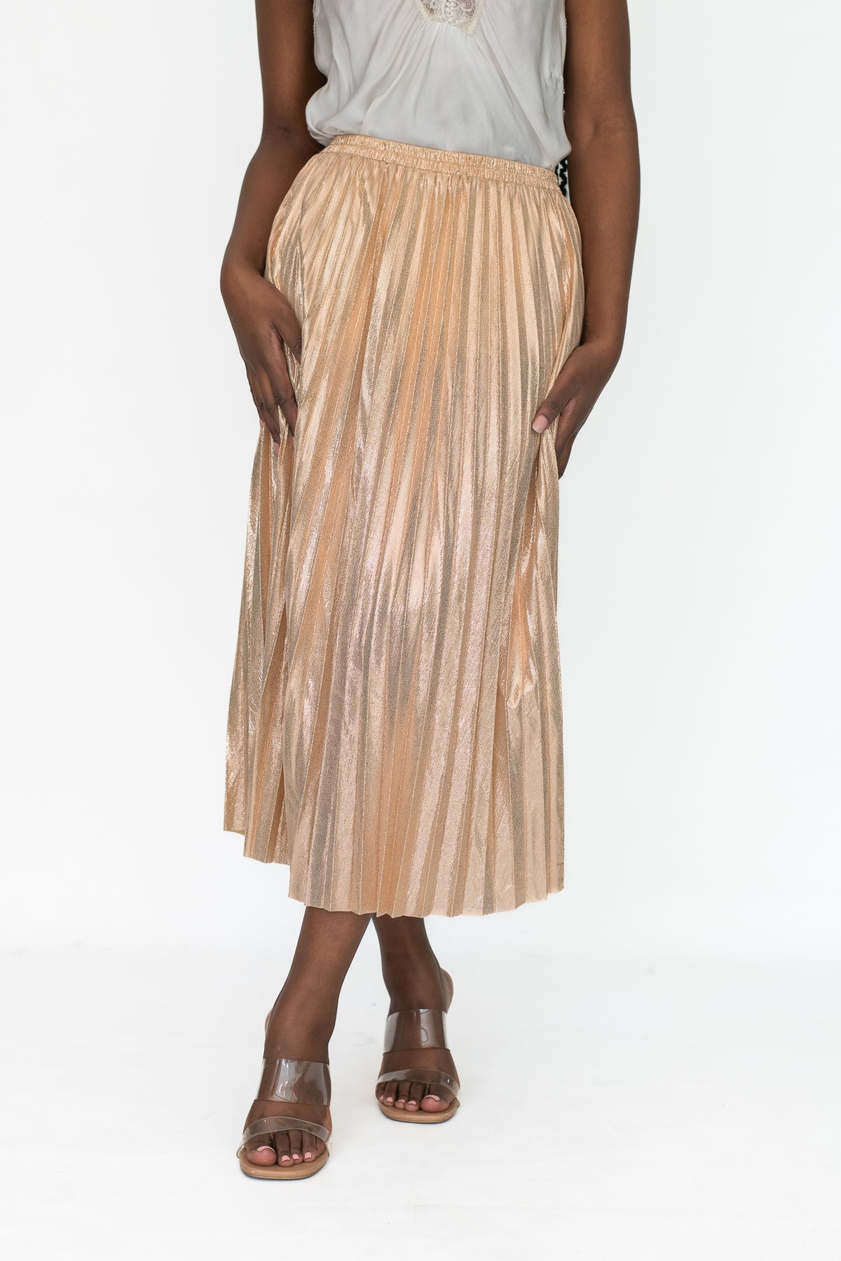 Pair with a simple fitted top or a tucked-in knit to balance the shimmer, and complete the look with strappy heels or ankle boots for a modern, boutique-ready outfit.