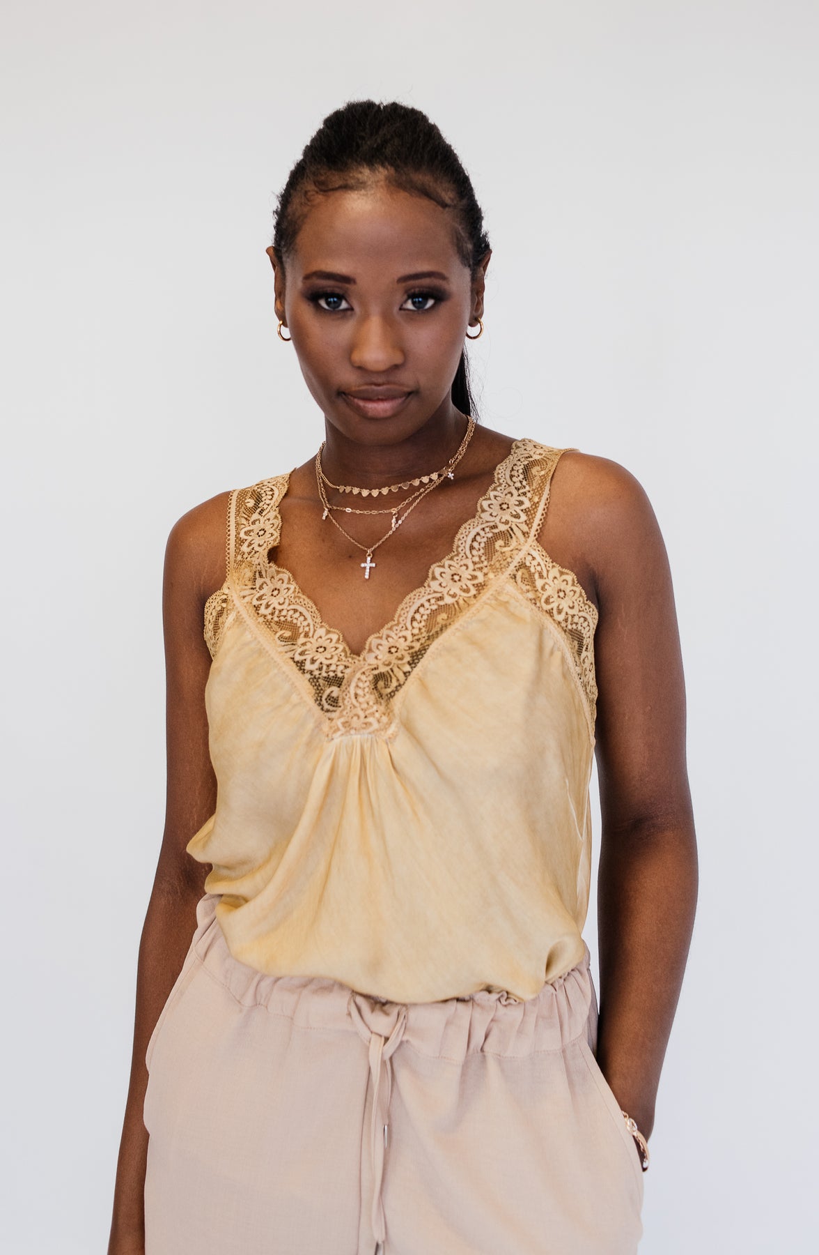 Pair this cami with high-waisted jeans and a tailored blazer for an effortlessly polished day-to-night look, or tuck it into a satin skirt for an elegant, evening vibe.