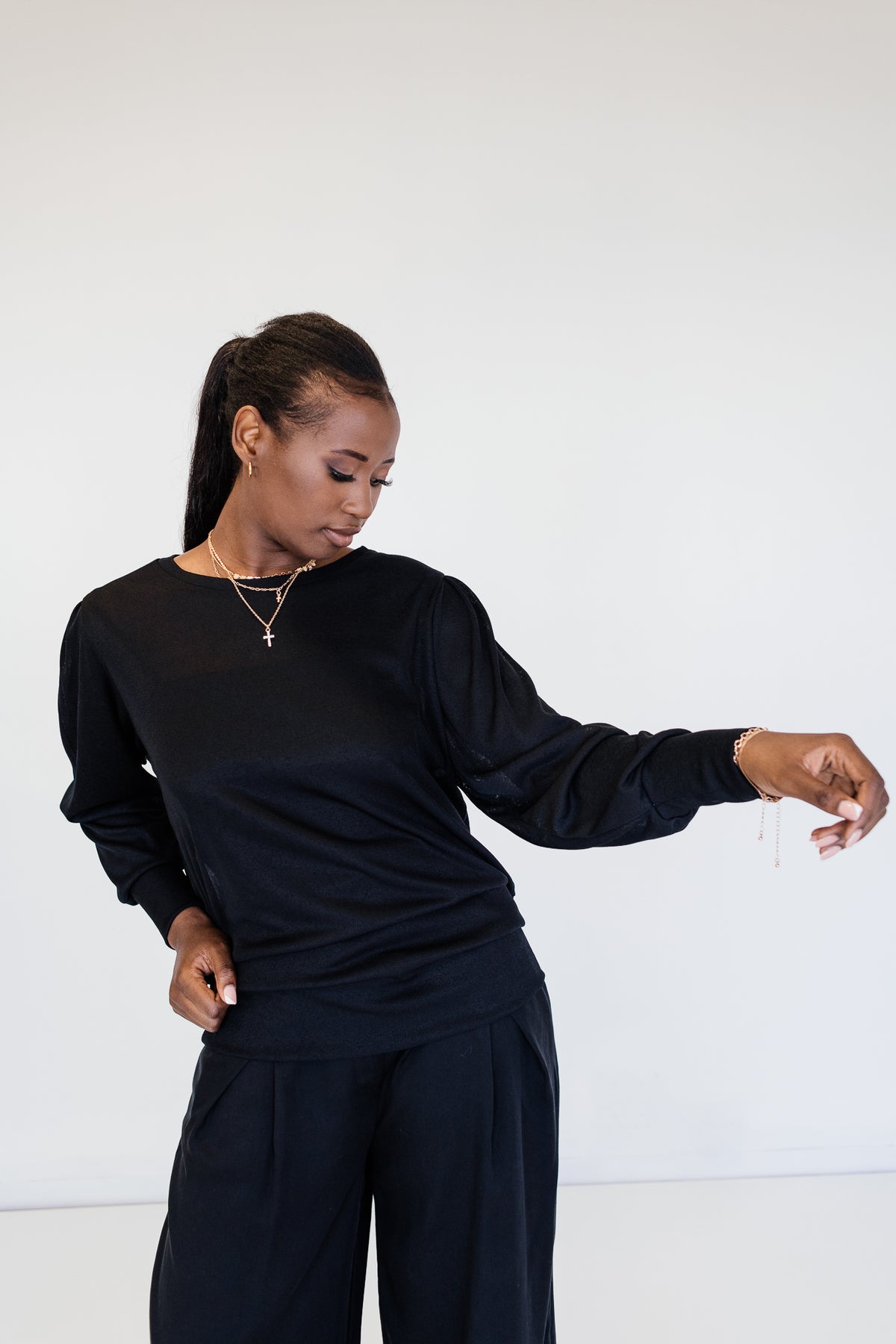 This long sleeve round neck top features a relaxed yet stylish silhouette with thick elasticated hems and cuffs that create a soft bell-shaped effect on both the sleeves and the waistline. The gathered detailing from the elastic adds texture and movement, giving the top a feminine and slightly voluminous finish. Perfect for effortless everyday wear with a touch of charm.