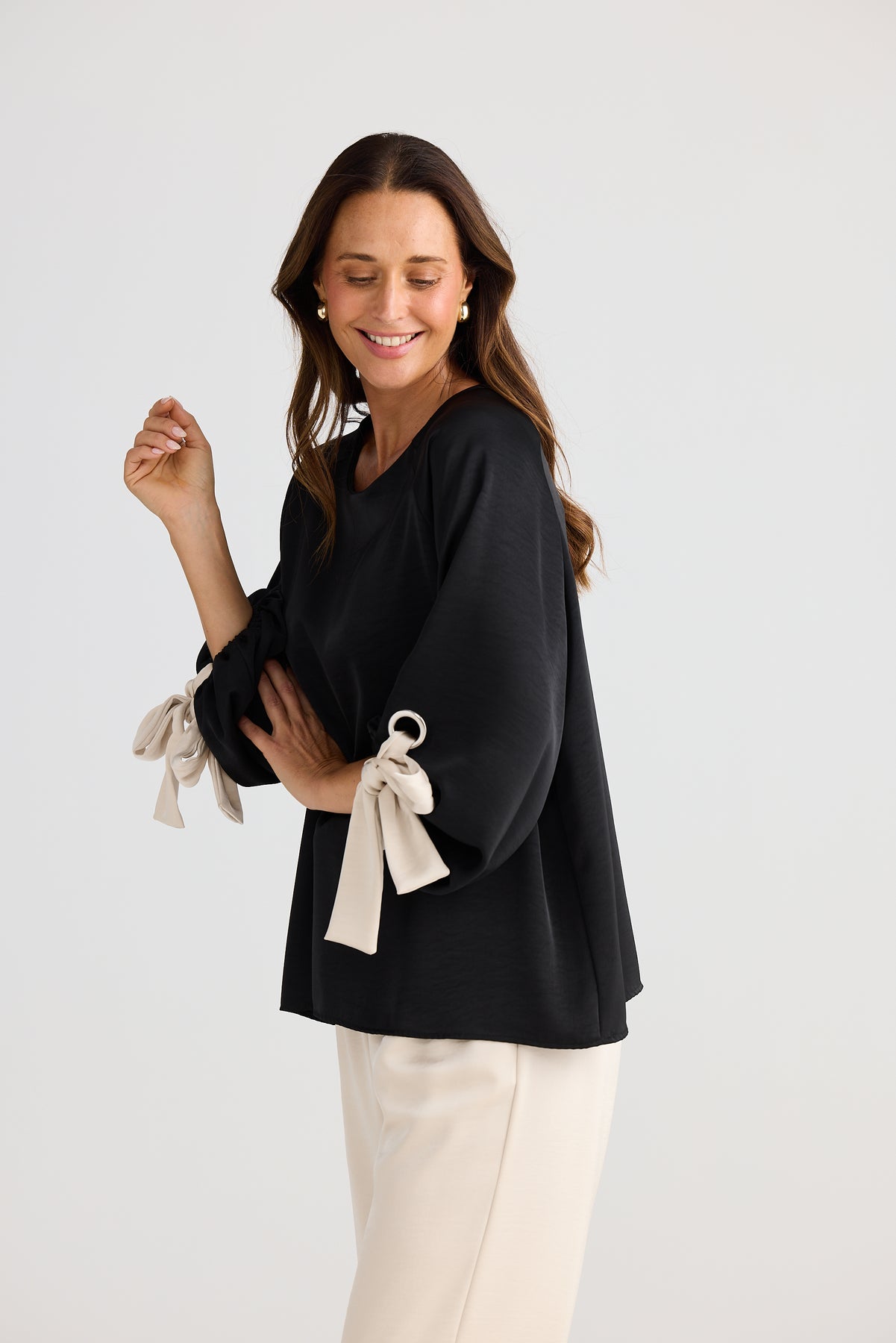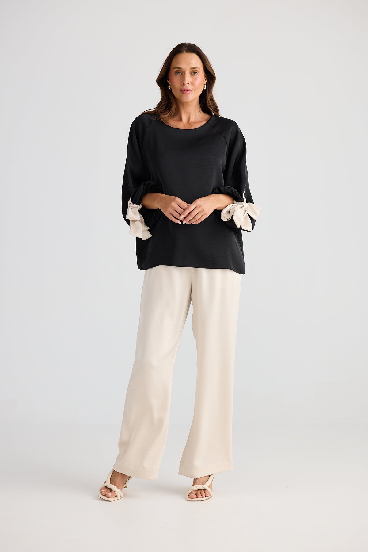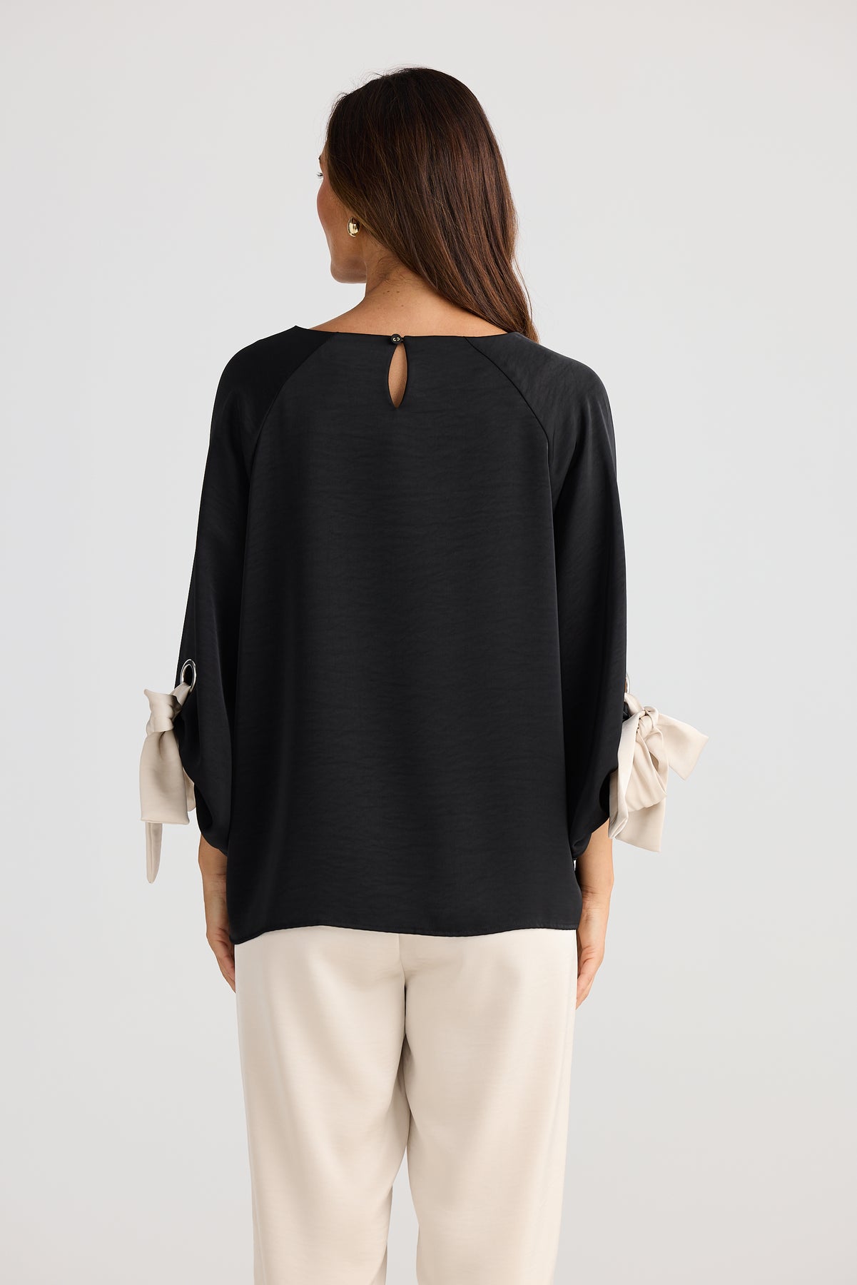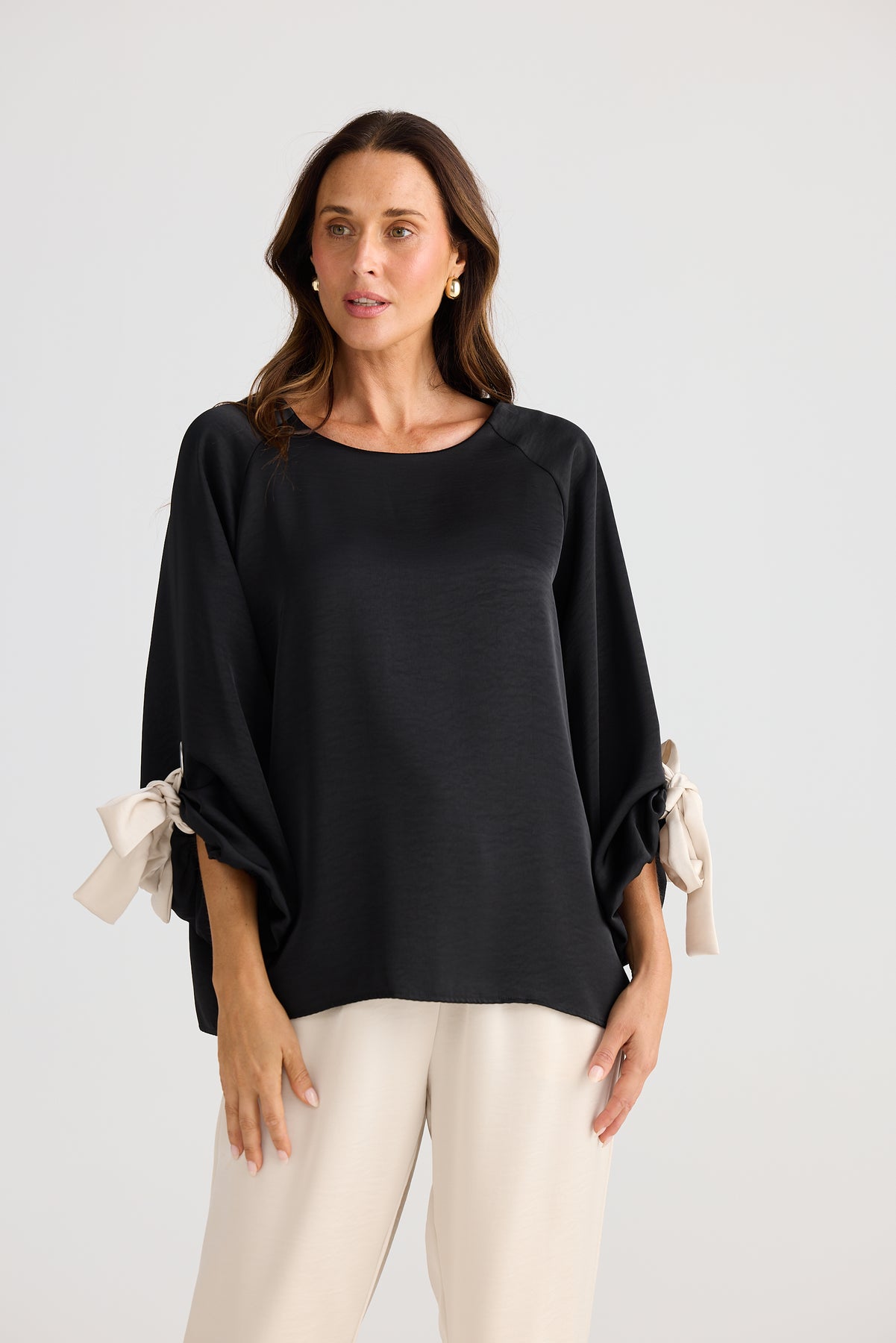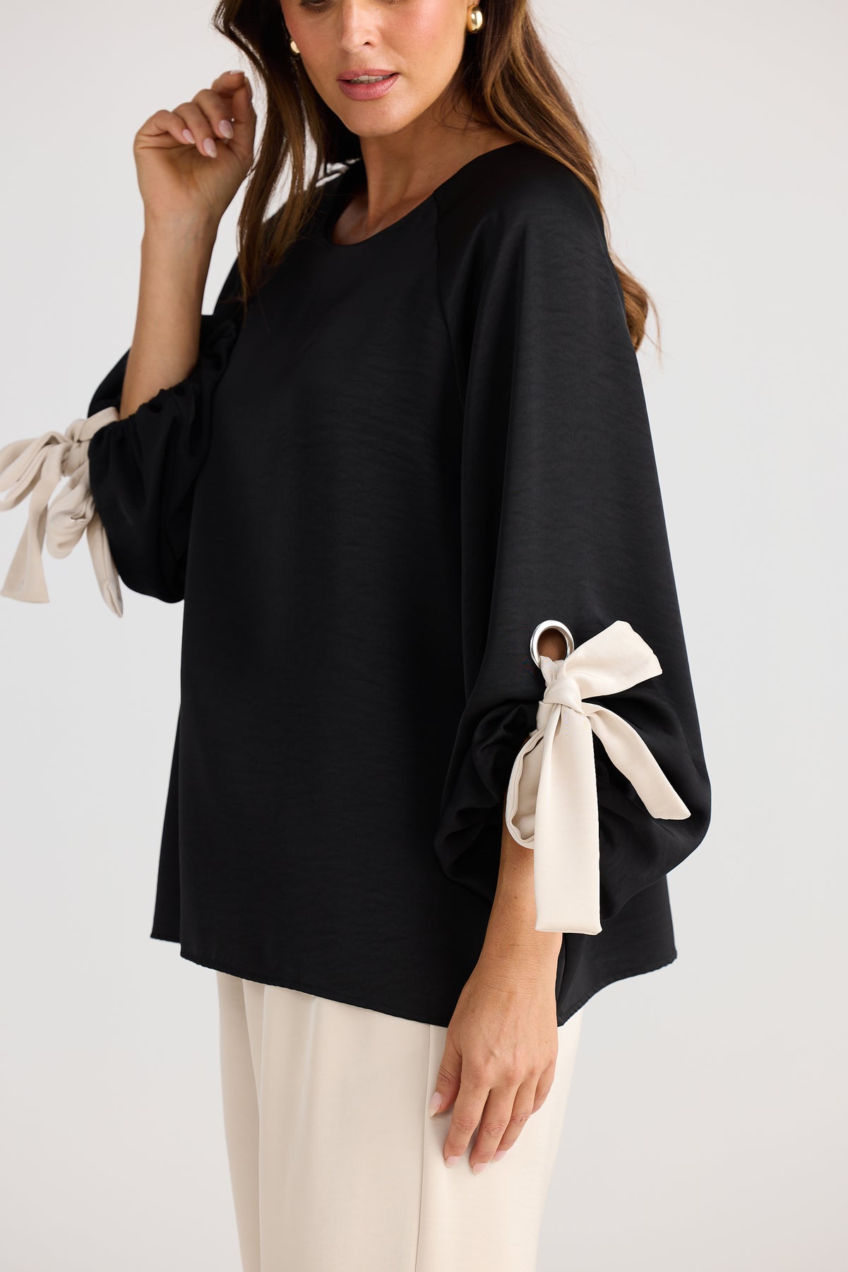 This sophisticated top blends relaxed elegance with contemporary charm. Designed with a round neckline and loose, flowing sleeves, it features statement bow ties at the cuffs for a feminine touch. The smooth, drapey fabric enhances its effortless silhouette, making it a perfect choice for both day and evening wear.