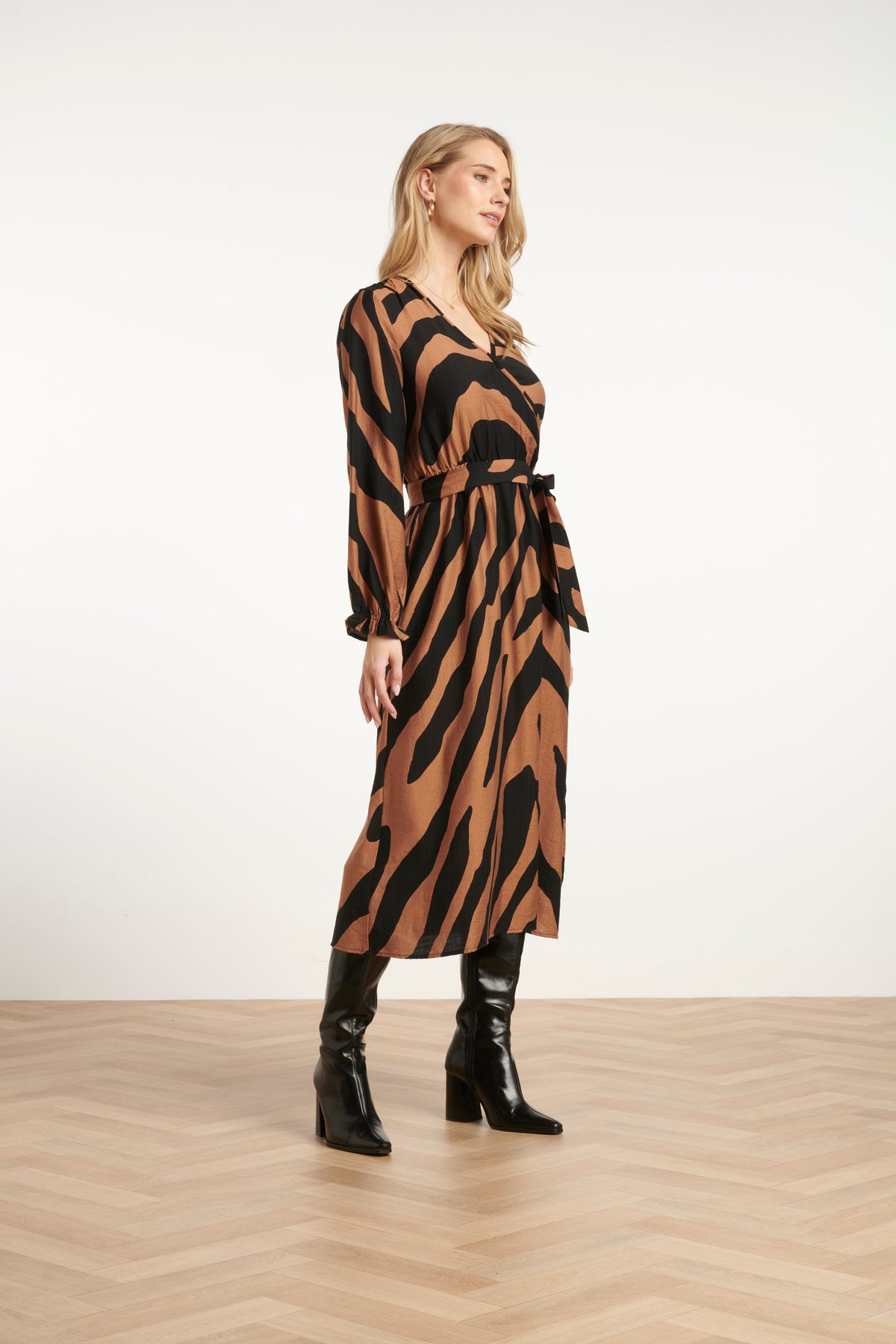 Turn heads with this effortlessly sophisticated midi dress, designed to blend bold pattern with timeless femininity. The striking zebra-inspired print in warm caramel and black creates a confident, fashion-forward look while the flattering wrap silhouette gently enhances the natural shape of the body.