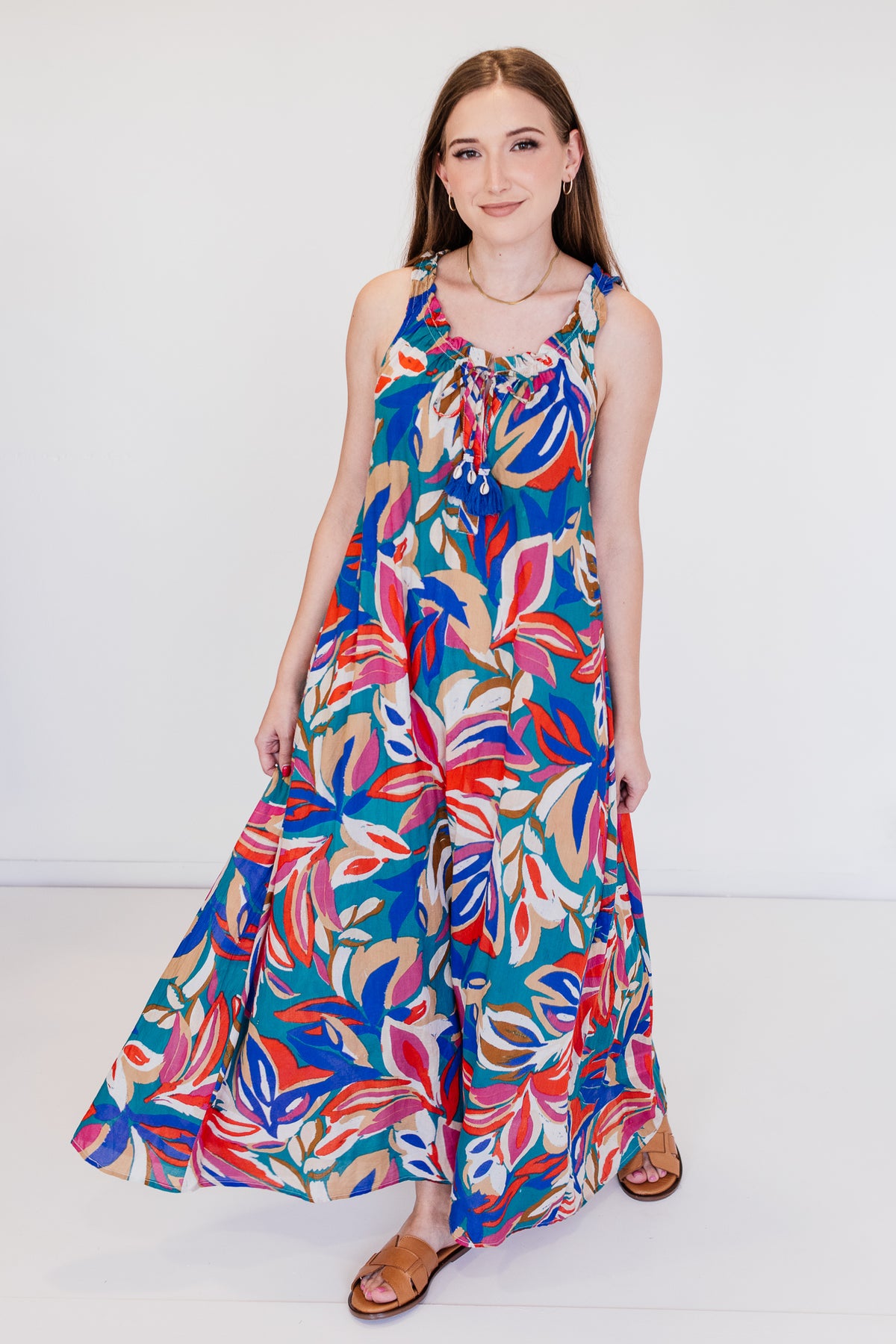 Make a vibrant statement in this playful sleeveless maxi dress, adorned with a colourful all-over print that radiates fun and energy. Designed with a flattering front tie detail, it cinches the waist beautifully while adding a touch of charm. The flowy silhouette and lightweight fabric make it perfect for sunny days and effortless movement.