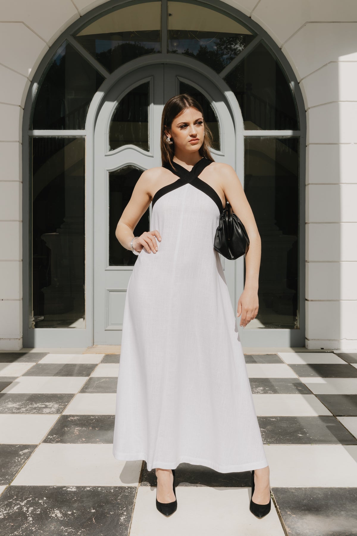 This elegant maxi dress features a sleek neckline with striking black cross-over straps that create a bold contrast against the crisp white fabric. The design flows effortlessly into a soft A-line silhouette, offering a graceful and elongated look. Crafted from lightweight, breathable material, it drapes beautifully while maintaining structure.