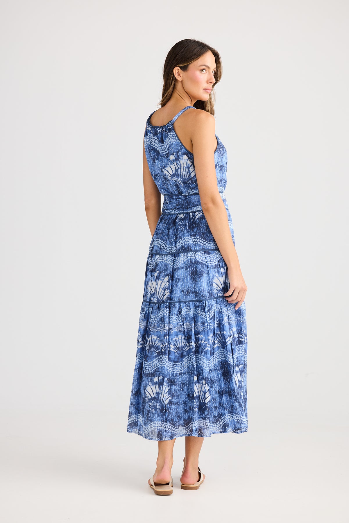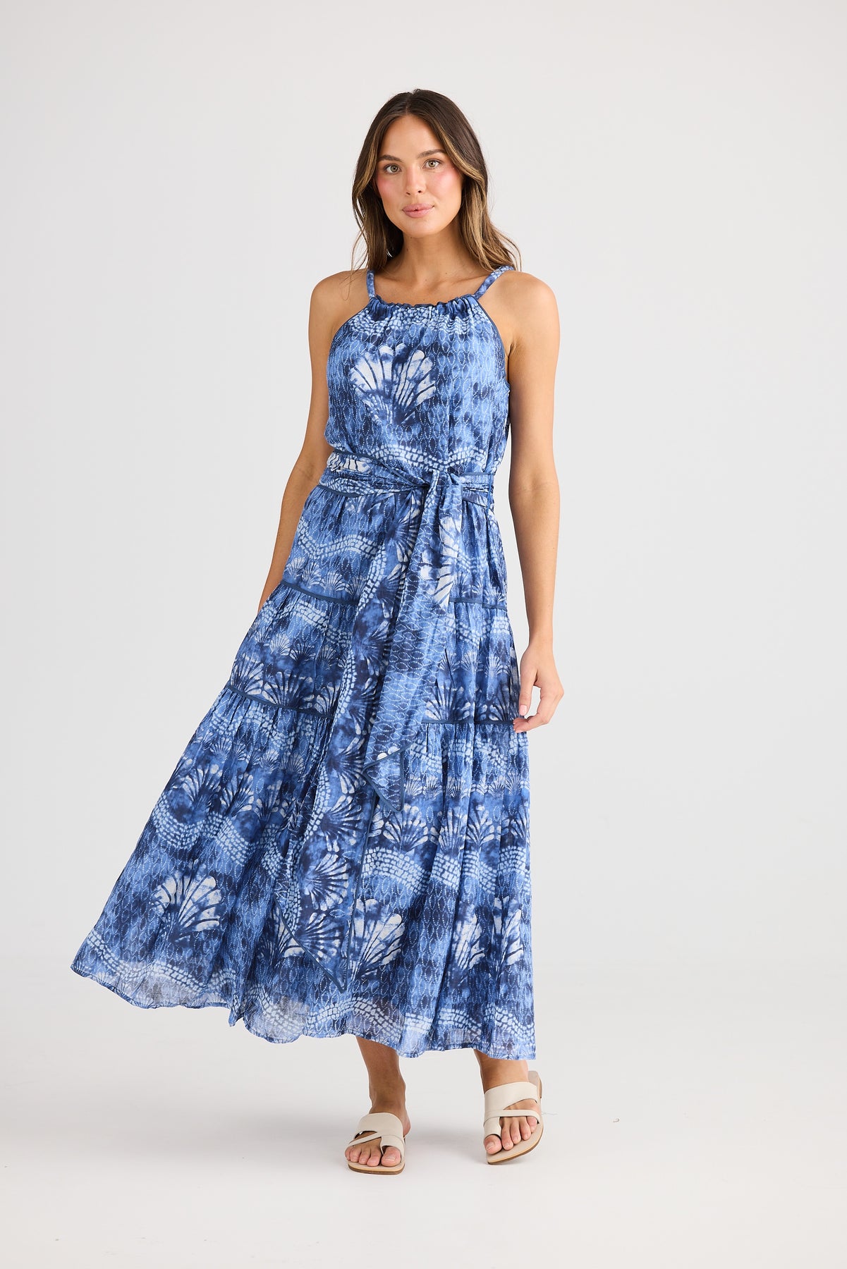 This elegant long blue sleeveless dress features delicate white dotted detailing that adds a soft, feminine charm. The rounded twisted neckline creates a refined focal point, enhancing the dress’s graceful silhouette. Designed with a matching belt, it accentuates the waist for a flattering fit. Flowing effortlessly to a long length, this dress blends sophistication with comfort — perfect for both daytime elegance and evening occasions.